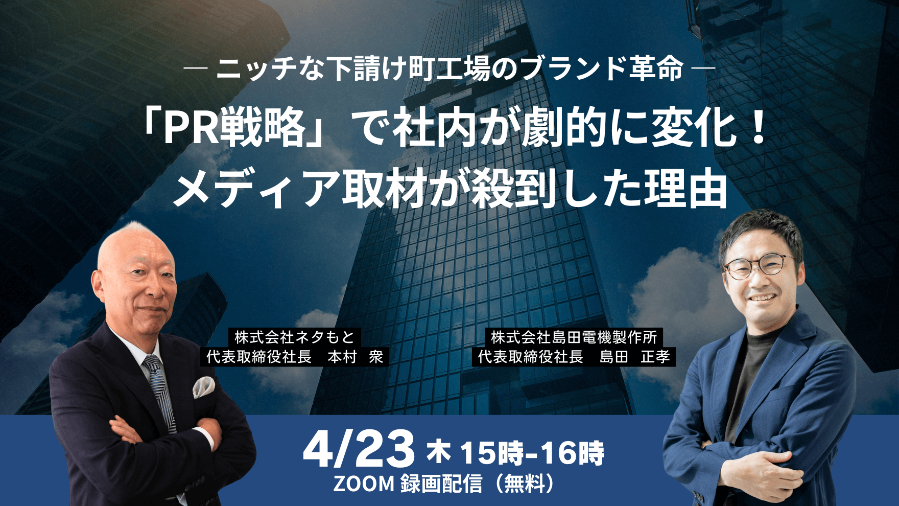 本講座では、経営戦略に「PR戦略」を取り入れ「広報の自走化」を実現した、株式会社島田電機製作所の代表取締役社長 島田 正孝 氏をゲストにお迎えし、弊社代表 本村 衆との「スペシャル対談」をお届けします。